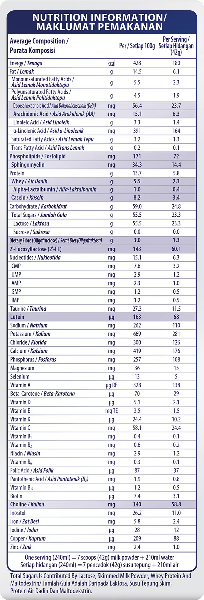 Each serving (240ml) = 7 scoops (42g) milk powder + 210ml water / Setiap hidangan (240ml) = 7 pencedok (42g) susu tepung + 210ml air Total Sugar Is contributed by Lactose, Skim Milk Powder, Whey Protein and Maltodextrin. / Jumlah Gula Adalah Daripada Laktosa, Susu Tepung Skim, Protein Air Dadih dan Maltodekstrin. |