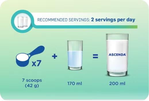 Hidangan yang susu rumusan tumbesaran ASCENDA disyorkan adalah sehingga dua hidangan sehari. Setiap hidangan adalah 200ml (7 sudu + 170ml air suam).