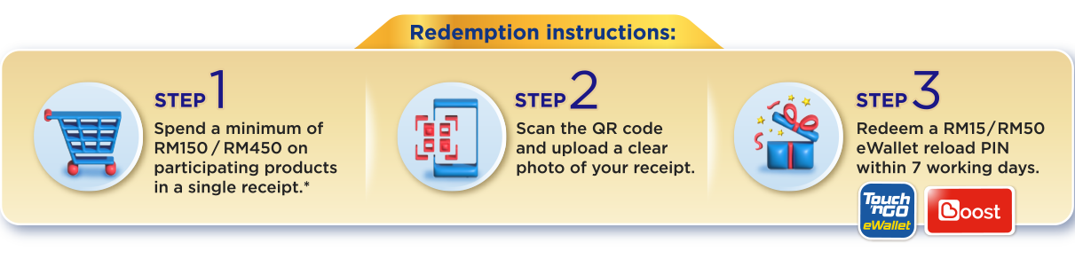 SPEND & BE REWARDED 20th April – 1st July 2026Redeem RM50 eWallet reload pin with purchase of RM450 ORRedeem RM15 eWallet reload pin with purchase of RM150 Terms & Conditions Participate Now Participating Products